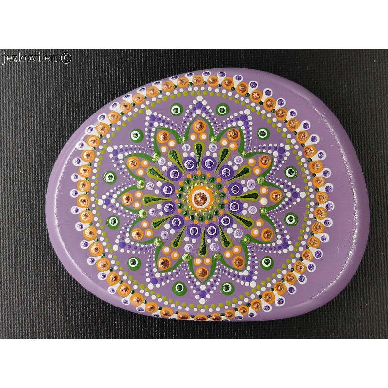 Umělý kamínek (odlitek) ručně malovaný. Akrylová barva, povrchová úprava lak. Vhodný pro interní i externí použití. Mandala pro potěšení, relaxaci, přísun energie, meditaci....