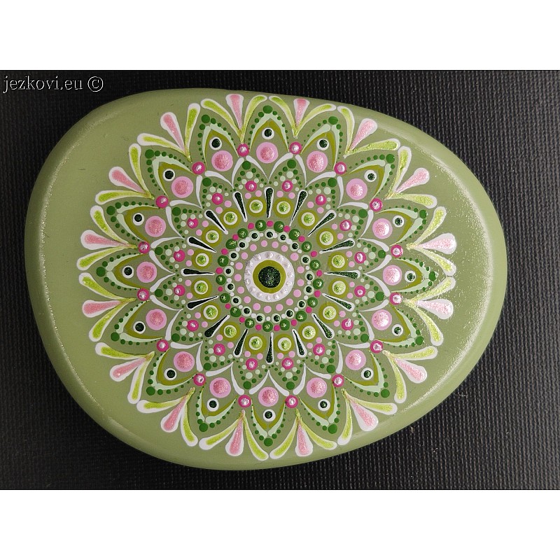 Umělý kamínek (odlitek) ručně malovaný. Akrylová barva, povrchová úprava lak. Vhodný pro interní i externí použití. Mandala pro potěšení, relaxaci, přísun energie, meditaci....