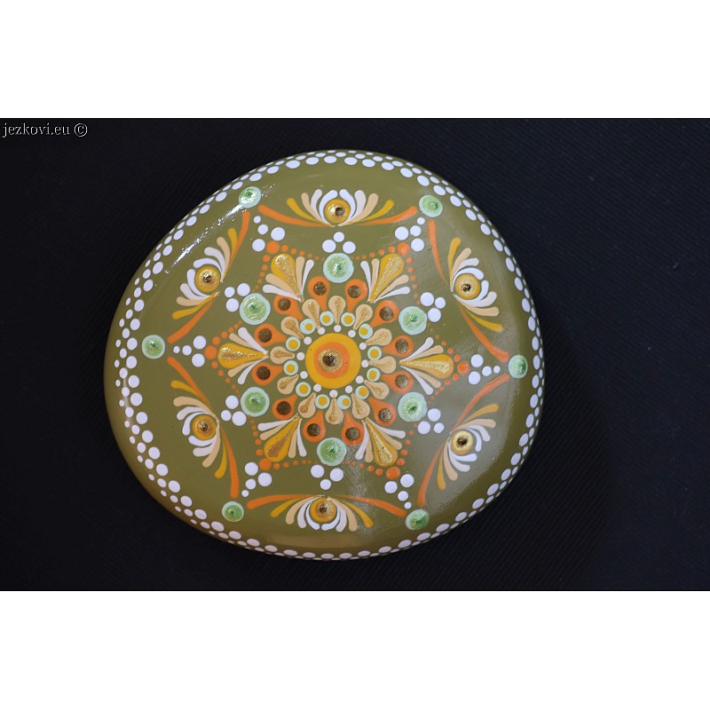 Umělý kamínek (odlitek) ručně malovaný. Akrylová barva, povrchová úprava lak. Vhodný pro interní i externí použití. Mandala pro potěšení, relaxaci, přísun energie, dobrou náladu, meditaci....