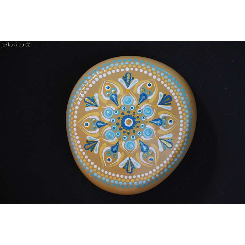 Umělý kamínek (odlitek) ručně malovaný. Akrylová barva, povrchová úprava lak. Vhodný pro interní i externí použití. Mandala pro potěšení, relaxaci, přísun energie, dobrou náladu, meditaci....