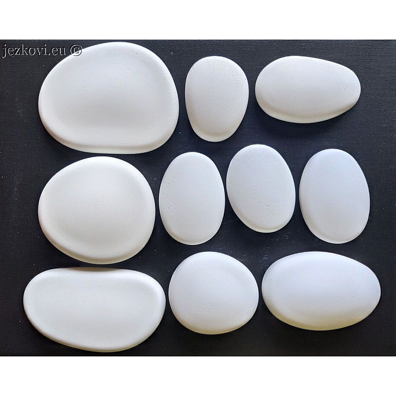 Umělý kamínek (odlitek) na malování. Bílý, hladký, různé velikosti. Vhodný pro interní i externí použití.