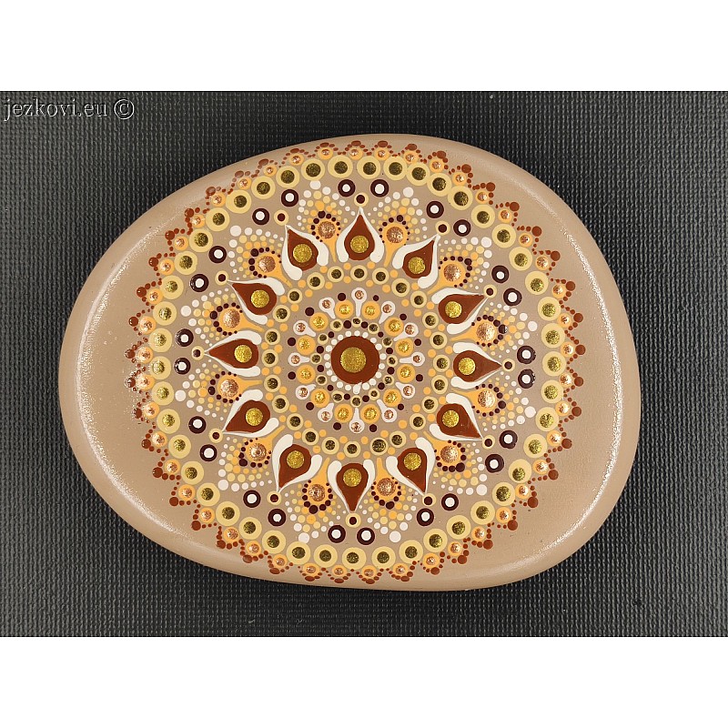 Umělý kamínek (odlitek) ručně malovaný. Akrylová barva, povrchová úprava lak. Vhodný pro interní i externí použití. Mandala pro potěšení, relaxaci, přísun energie, meditaci....