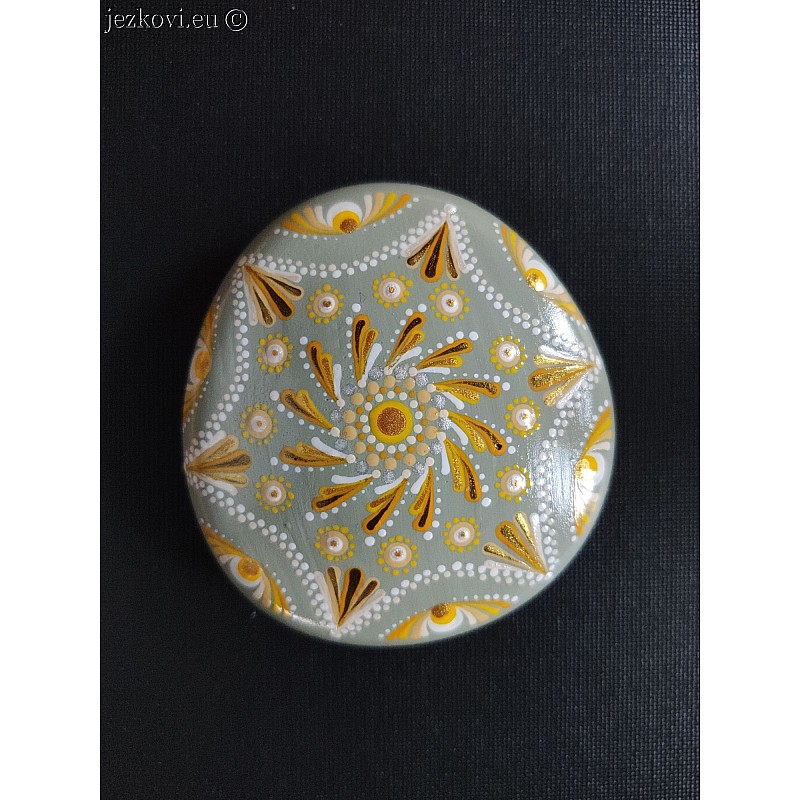 Umělý kamínek (odlitek) ručně malovaný. Akrylová barva, povrchová úprava lak. Vhodný pro interní i externí použití. Mandala pro potěšení, relaxaci, přísun energie, dobrou náladu, meditaci....