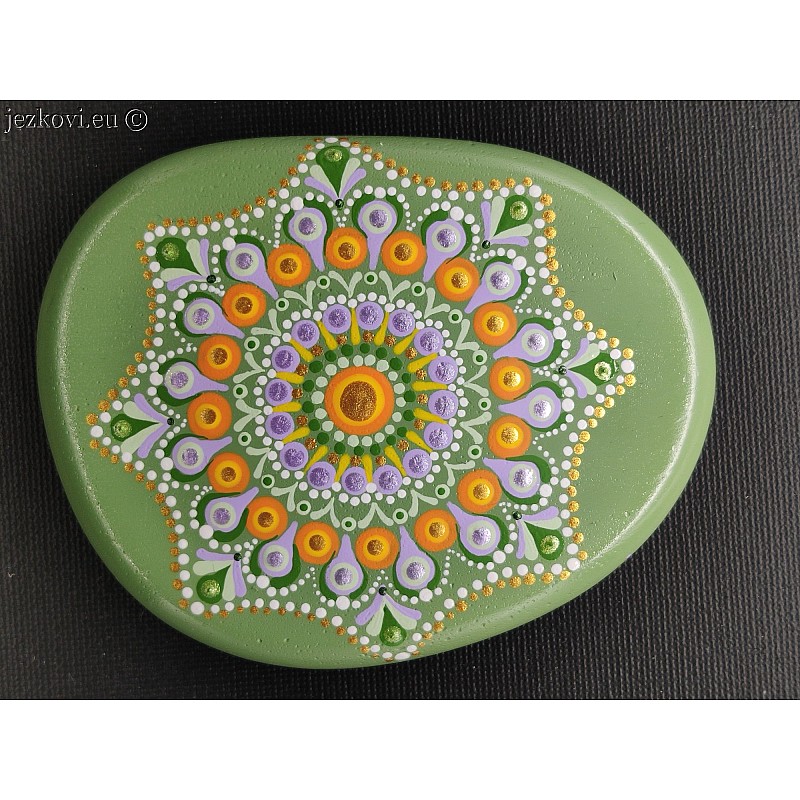 Umělý kamínek (odlitek) ručně malovaný. Akrylová barva, povrchová úprava lak. Vhodný pro interní i externí použití. Mandala pro potěšení, relaxaci, přísun energie, meditaci....
