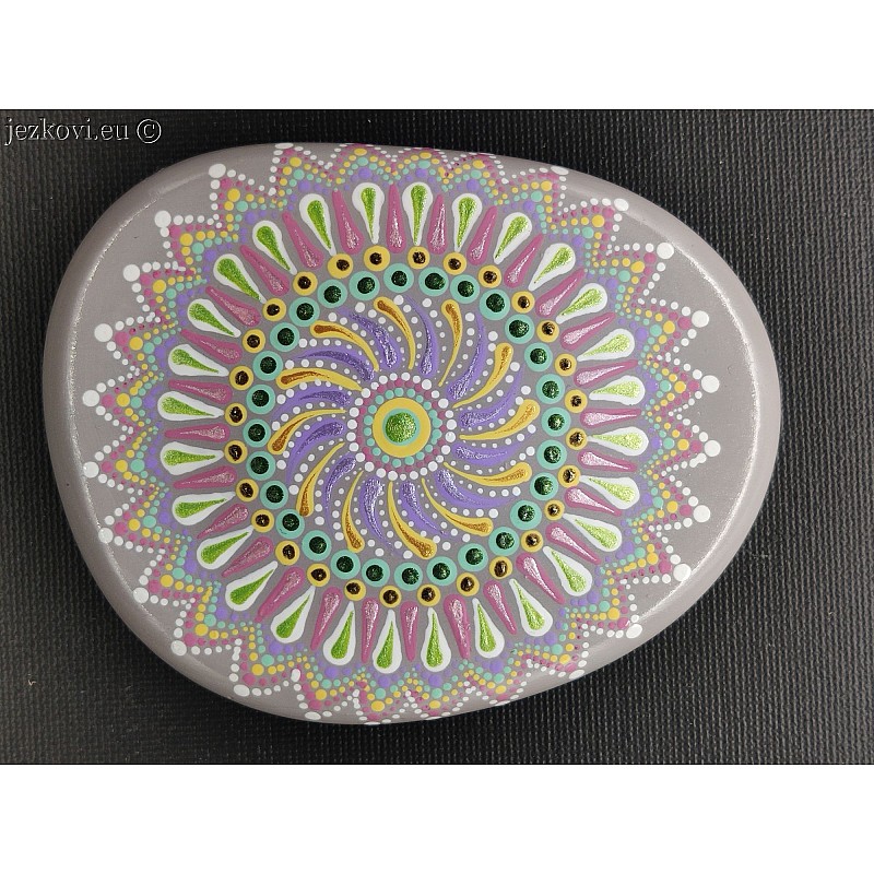Umělý kamínek (odlitek) ručně malovaný. Akrylová barva, povrchová úprava lak. Vhodný pro interní i externí použití. Mandala pro potěšení, relaxaci, přísun energie, meditaci....