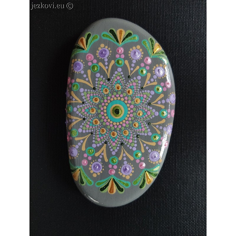 Umělý kamínek (odlitek) ručně malovaný. Akrylová barva, povrchová úprava lak. Vhodný pro interní i externí použití. Mandala pro potěšení, relaxaci, přísun energie, dobrou náladu, meditaci....